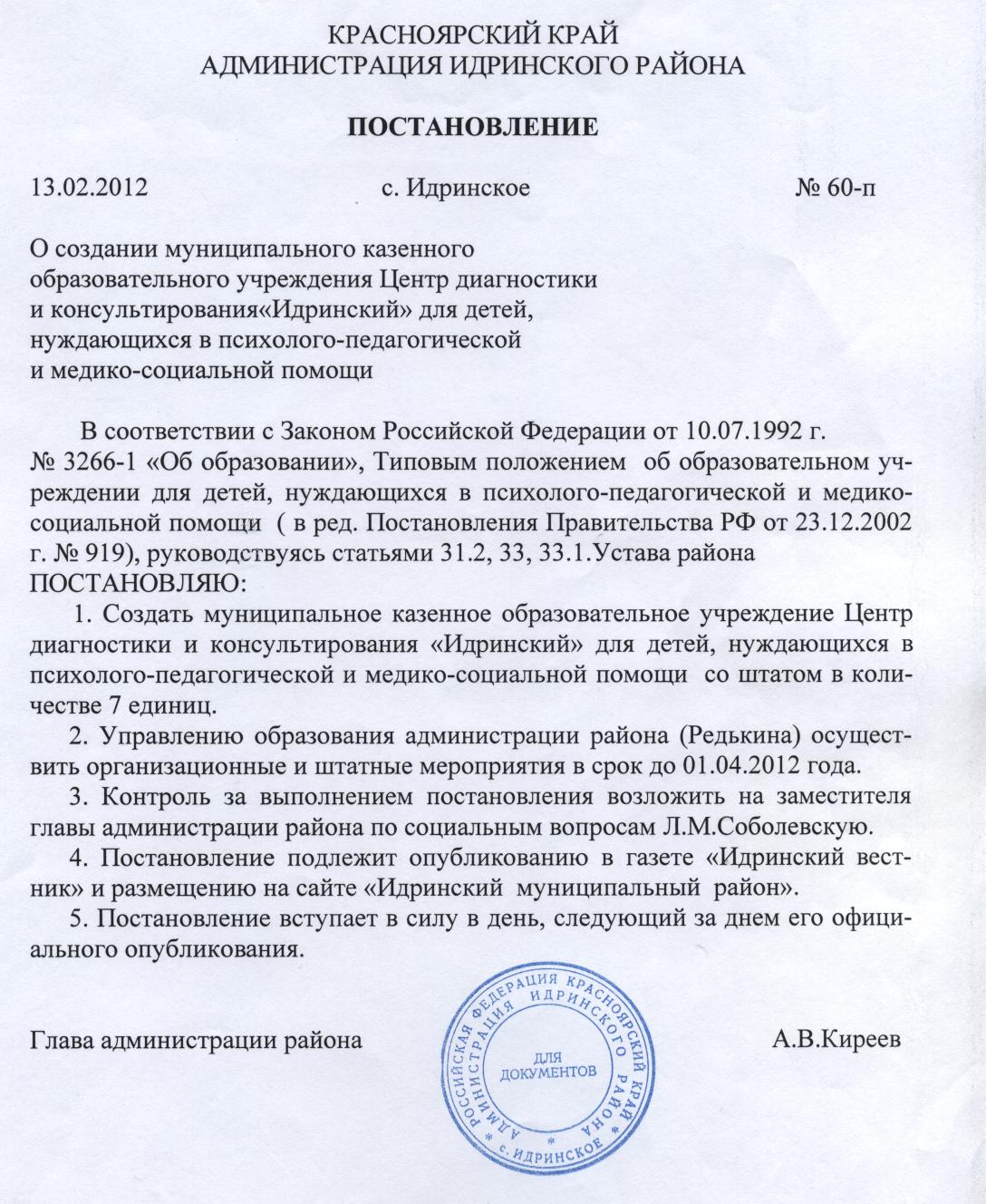 | ПОСТАНОВЛЕНИЕ АДМИНИСТРАЦИИ ИДРИНСКОГО РАЙОНА "О создании муниципального казенного образовательного учреждения Центр диагностики и консультирования "Идринский" | |